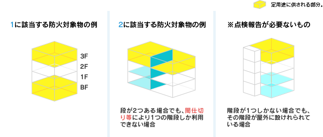 防火対象物の用途に該当する部分のある防火対象物では、防火対象物全体の収容人員の条件に応じて防火対象物全体で点検・報告が義務となります。 ※防火対象物定期点検報告が義務となる防火対象物の全ての管理権原者(テナント含む)は、点検報告が義務となります。